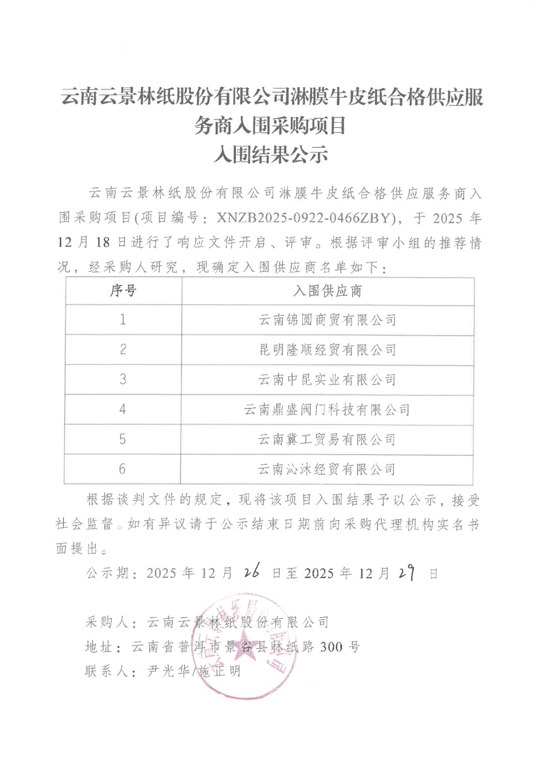云南云景林紙股份有限公司淋膜牛皮紙合格供應服務商入圍采購項目入圍結(jié)果公示