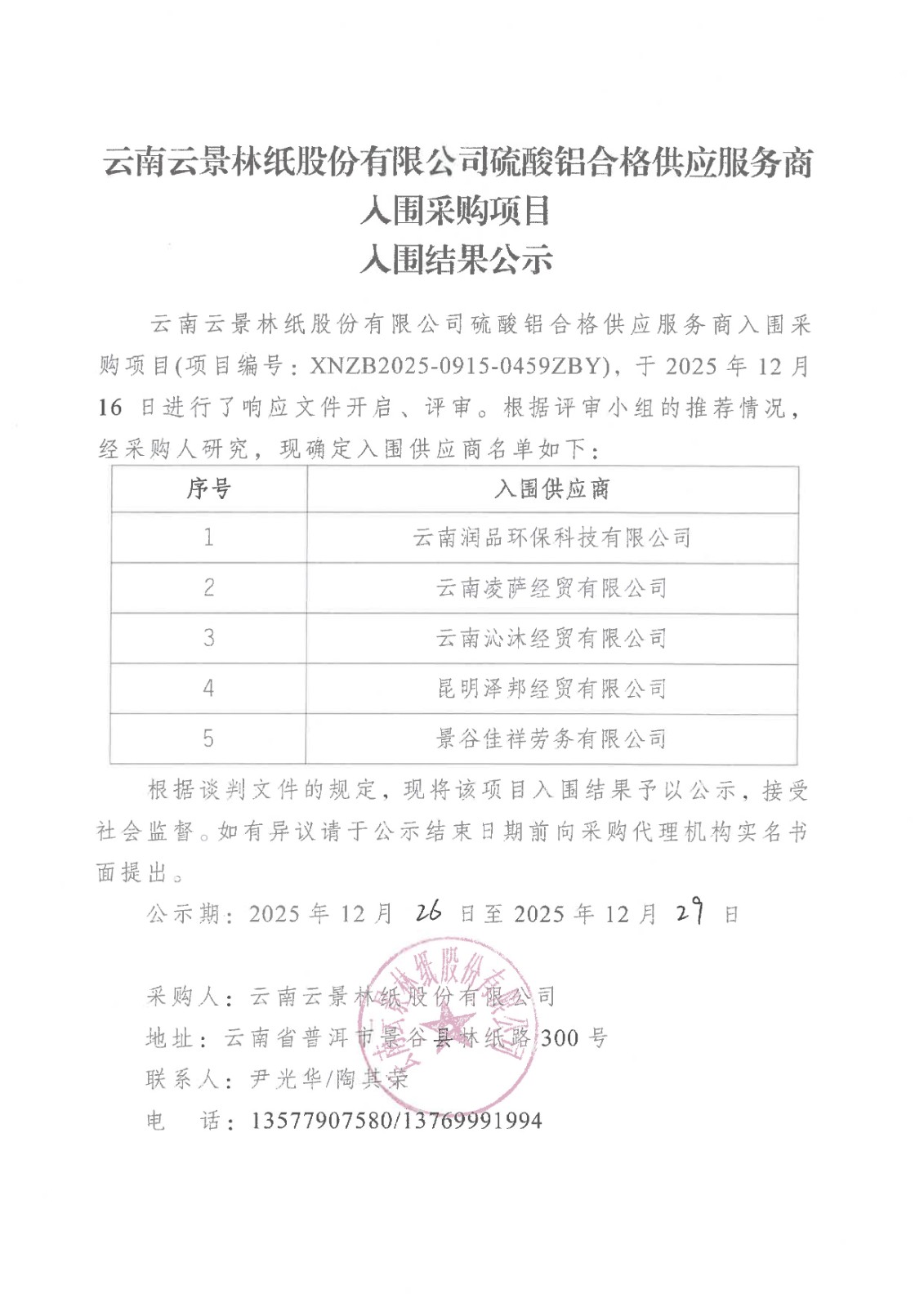 云南云景林紙股份有限公司硫酸鋁合格供應(yīng)服務(wù)商入圍采購(gòu)項(xiàng)目入圍結(jié)果公示