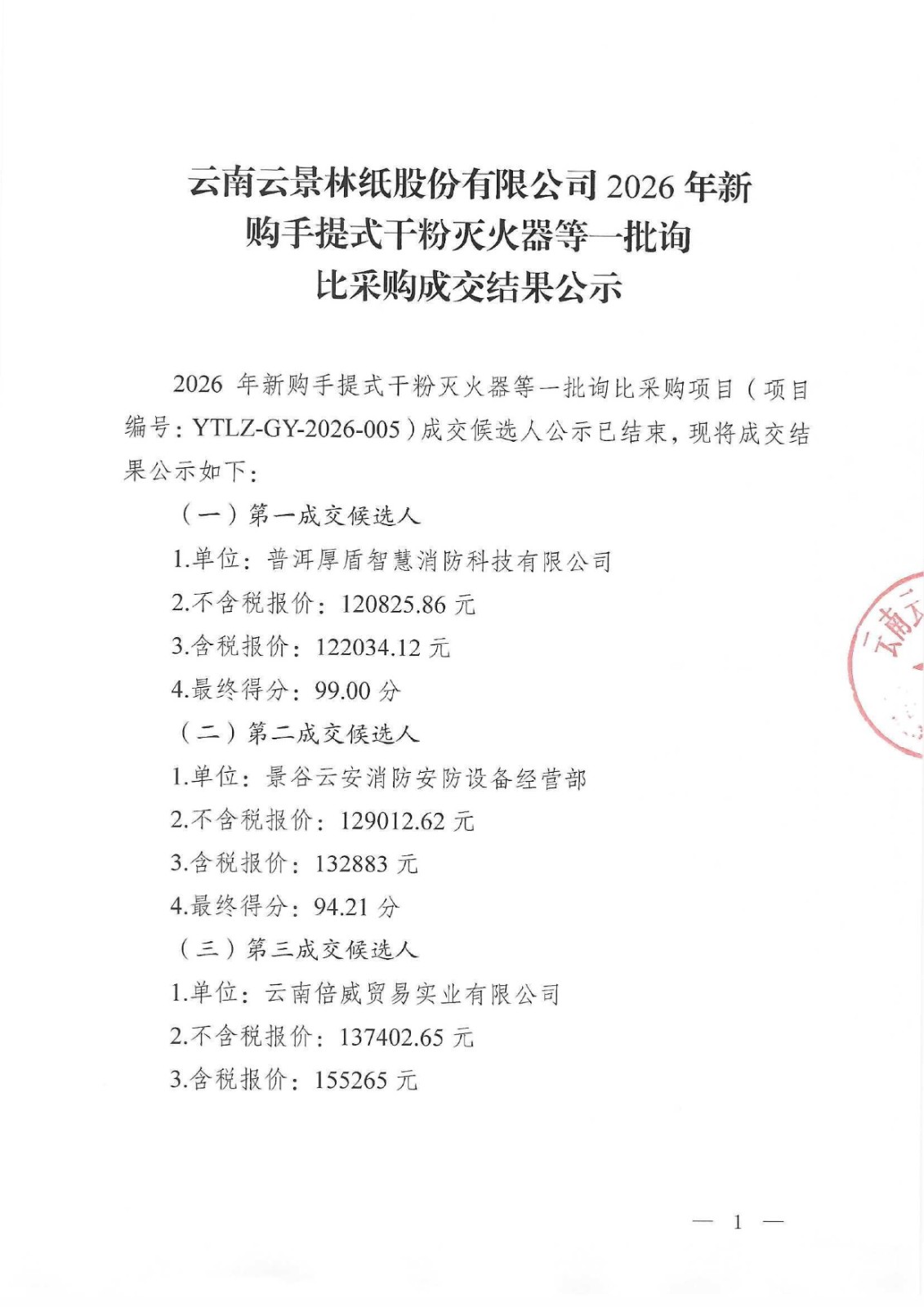 云南云景林紙股份有限公司2026年新購手提式干粉滅火器等一批詢比采購成交結(jié)果公示
