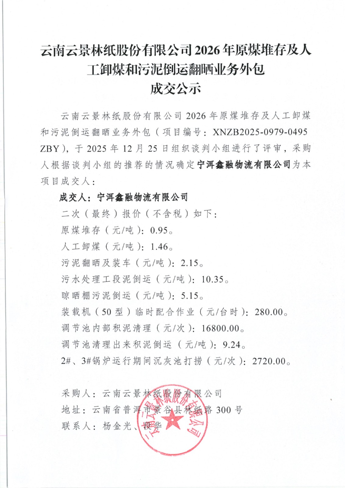 云南云景林紙股份有限公司2026年原煤堆存及人工卸煤和污泥倒運翻曬業(yè)務(wù)外包成交公示